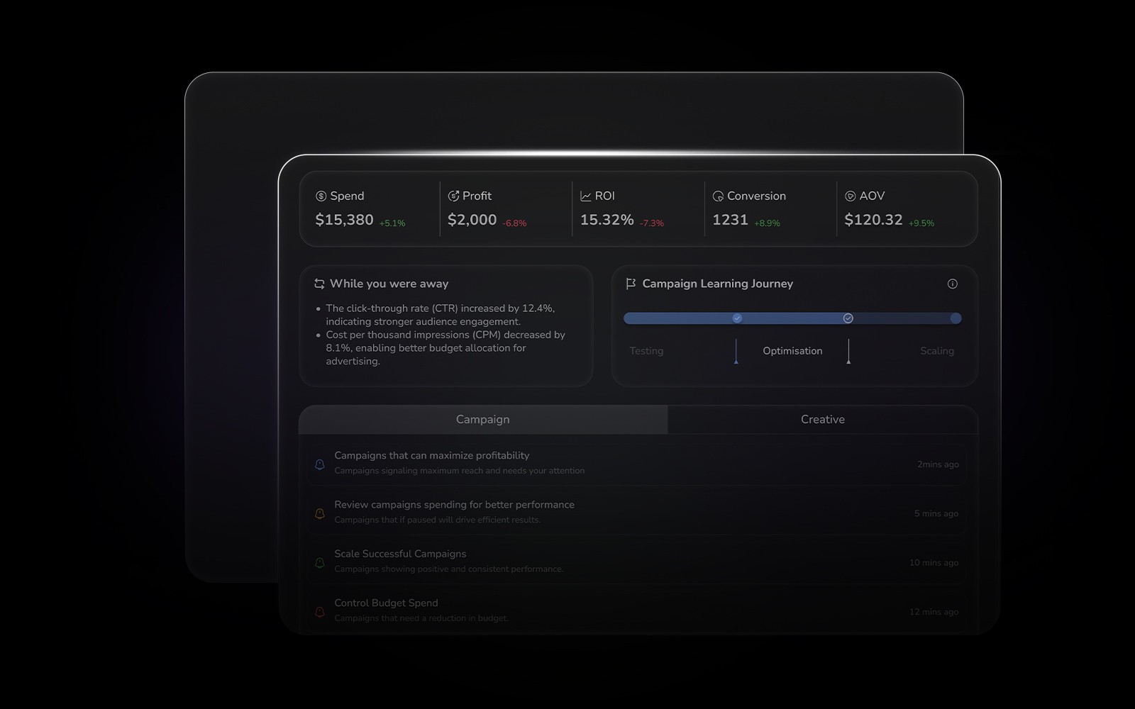 Go from idea to live campaigns instantly with preflight checks and health snapshots confirming delivery and KPI tracking.