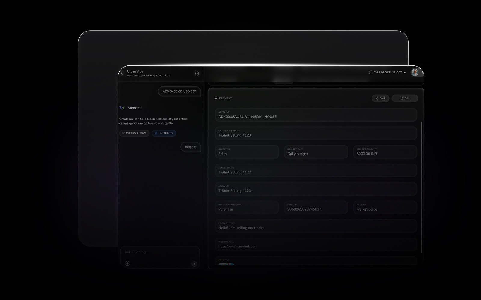 Build entire ad campaigns in minutes. Budgets, targeting, creatives, captions, UTMs — all done in one guided flow.