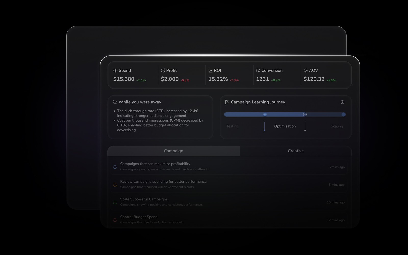 Live dashboards show what’s working. Get hook-level breakdowns, performance dips, scaling signals, and spend triggers.