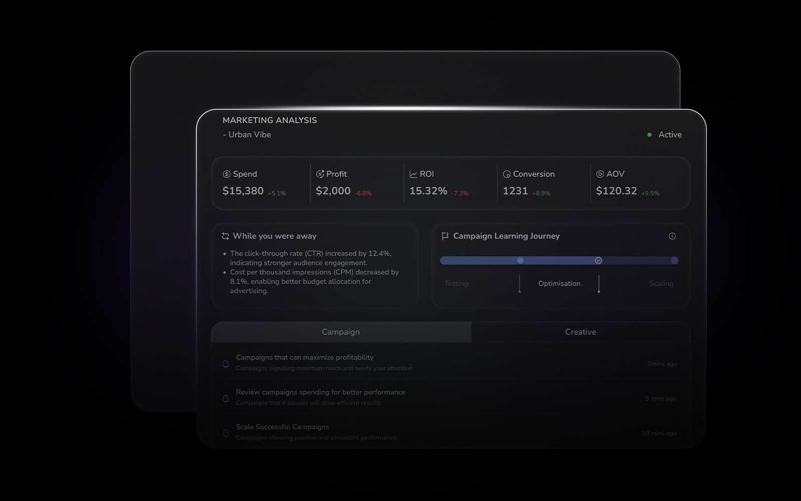 Always-on automations rotate tired creatives, reallocate budget to winners, and tune bids/pacing with one-tap fixes.